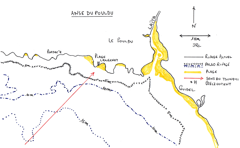 - Sur l’île d’Yeu, un chercheur recense les paléo-tempêtes, et ses carottes révèlent 2 périodes précises ou le sable marin est plus grossier (venant donc des profondeurs) et datés des 2 tsunamis présumés. cliquez.