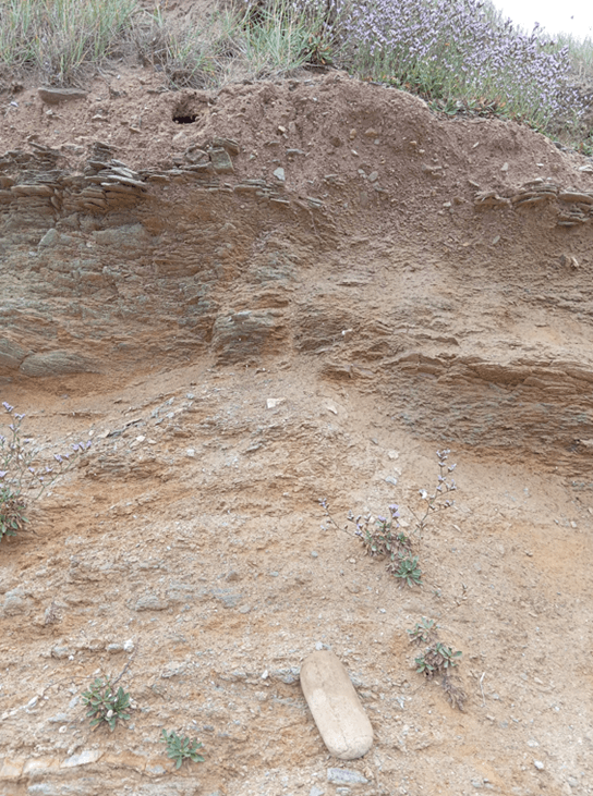 Pour Bellangenet, l’idéal serait de trouver comme à Luzeronde un objet néolithique dans la couche suspecte permettant de dater l’évènement. Pourquoi pas une hache datable par son style dans la période 3400-3000 avant JC, période présumée du glissement Morbihan ? Je me lève d’un bond et me dirige droit vers la falaise pour voir de plus près cette anomalie sédimentaire. Je m’approche de la paroi, l’érosion semble récente et des pierres incrustées dépassent d’une ligne située à 4 mètres du sol. Du pied de la falaise, une grosse pierre claire se distingue nettement des autres. A moitié dégagée, elle semble arrondie sur la tranche, plate, bien lisse et son arrête bien dessinée. Est-ce une hache ?