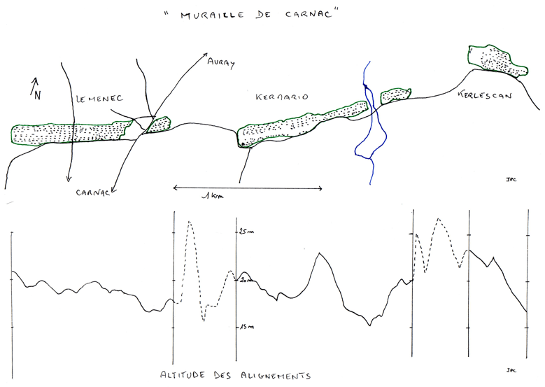 Mais la constante demeure ce niveau situé sur la crête dominant la mer. (Carte : Altimétrie des alignements ou « muraille » de Carnac).