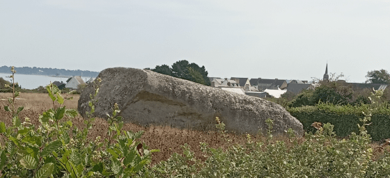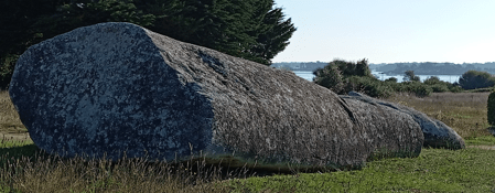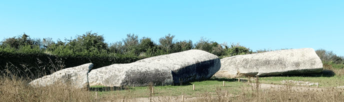 Autre mystère, c’est le fait que toutes les pierres du site ont été réemployées ailleurs, sauf celles du grand menhir. Même si le poids des 2 plus gros blocs est dissuasif (+ de 100 tonnes), on aurait pu enlever la tête du menhir qui fait moins d’un mètre. C’est donc une chance de le trouver au complet et dans la position initiale de la chute plus de 6000 ans après l’évènement. Superstition ? Volonté de témoigner ?