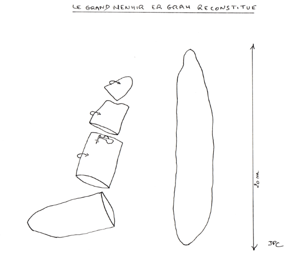 20 m de hauteur, et avec une masse de 330 tonnes il serait resté debout entre 6500 et 6300 avant aujourd’hui avant de se retrouver éclaté en 4 morceaux qui se recoupent exactement comme les pièces d’un puzzle sur ce site de Locmariaquer.