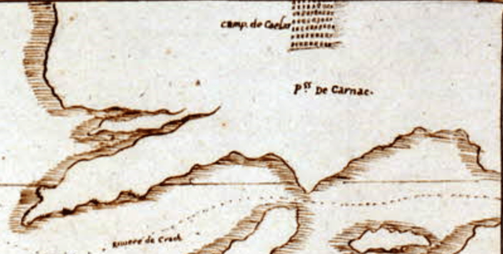 « De Tous ces monuments, ce qui frappe le plus si vous exceptez La Roche aux fées dont je parlerai dans la suite, est cette grande quantité de pierres qui se voient dans une lande près de Carnac. Les moins hautes ont entre 2.5 et 3 mètres hors de terre. Elles sont disposées en 8 rangs. Ce lieu s’appelle Camp de César. Il est aisé de juger qu’une grande quantité de pierres peut avoir été amassée pour former une butte ou une espèce de pyramide. Telle est celle de Carnac même et sur laquelle est bâtie la Chapelle Saint Michel, on conçoit encore facilement qu’un certain nombre de pierre peut avoir été planté quoiqu’avec des peines infinies pour en supporter quelques autres de grandeur plus considérable et inhumer les corps dessous. Mais à quel usage cette phalange de pierres rangées en ordre de bataille dans une lande et élevée verticalement ? ce n’est pas comme le prétend M. Deslandes un effet du bouleversement causé par le déluge. Le hasard ne place pas tant d’ordre et de régularité dans le même endroit dans une si petite étendue d’un terrain plat et qui n’a jamais pu être plus élevé qu’il ne l’est. Serait-ce un cimetière ? Serait-ce un champ de bataille où se fut donné un combat signalé et où l’on eut voulu honorer la mémoire de ceux qui y avaient péri ?
