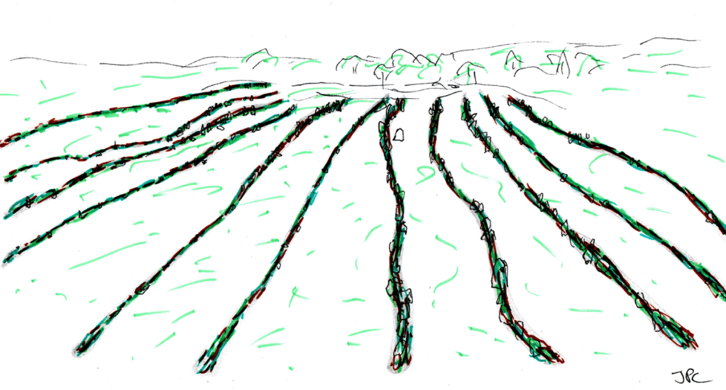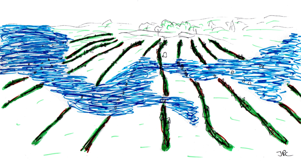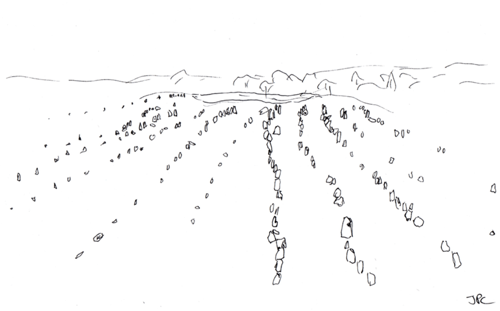 Mon hypothèse est que ces travaux sont accompagnés d’un remplissage des espaces entre les menhirs pour compléter les files de pierres par de la terre et de la vase, avec des branchages coincés et tenus par les mégalithes dressés.
