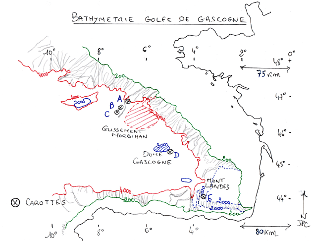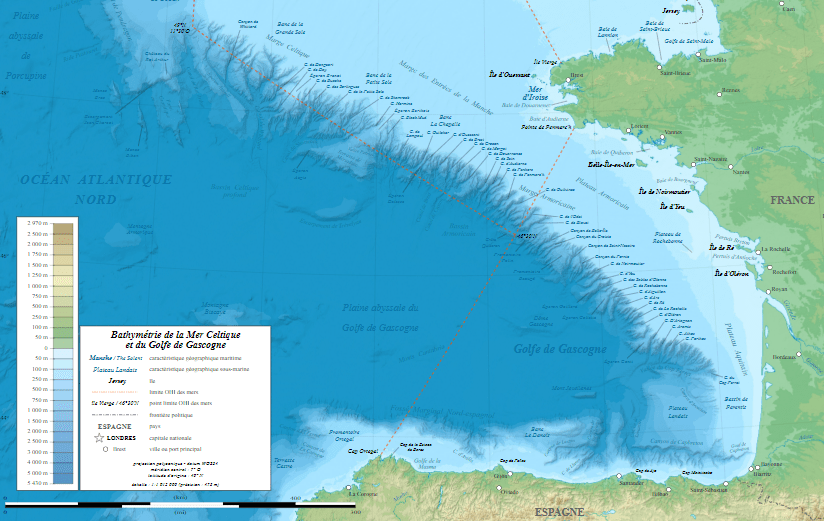 Le golfe de Gascogne se caractérise par une diagonale de 50 km de large appelée marge continentale qui sépare le plateau sableux situé à -200 mètres de profondeur des abysses situées à -4500 mètres.