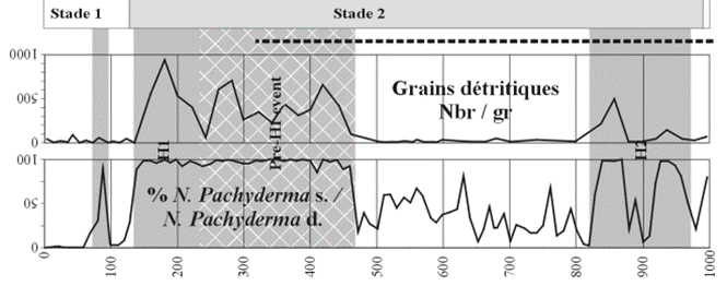 Le réchauffement de la période suivante se retrouve de 8 mètres à 4.5 mètres avec moins de Pachydermas sénestres et surtout peu de grains détritiques (sables quartziques). A partir de 4.5 mètres, (il y a 14 000 ans) le froid revient (Henrich 1 ou Dryas ancien) avec des dépôts détritiques (quartz) posés par les icebergs, les Pachydermas sénestres sont dominants. Le réchauffement Allerød de 1000 ans à partir de 1.4 mètres sur notre carotte voit le retour des dextres et l’absence d’Icebergs.