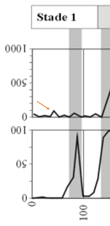Entre 30 et 50 cm avant la partie grise du Dryas récent, nous relevons une pointe (flèche) du nombre de grains détritiques sans modification climatique et qui se situe donc par extrapolation dans la fourchette de 4 387 à 7 312 ans, soit 2400-5300 avant JC. (Avec une précision millénaire * qui peut englober les 2 tsunamis).