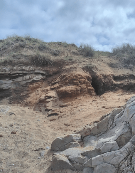 La tempête Xinthya a balayé la dune auparavant protégée par un éperon rocheux. Depuis, après chaque tempête hivernale, le sable se découvre un peu plus et des archéologues vigilants ont pu détecter un foyer préhistorique visible par la couleur rougie du granite. Une fouille d’urgence a été effectuée sur 4m2 et ses résultats en 2019 nous sont pertinents.