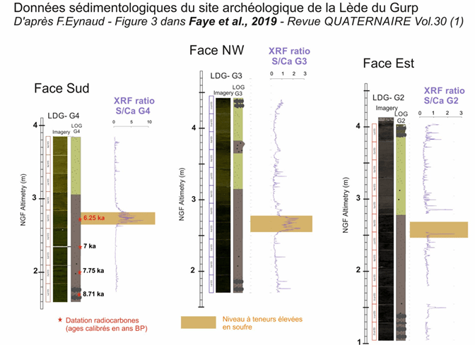 Fait notable à 2.5 m d’altitude au sommet de la couche tourbeuse U1 et juste en dessous de la couche U2, on détecte 10 à 15 cm de teneur élevée en soufre pour les 3 séquences étudiées (carottes G2, G3 et G4). Une datation faite à ce niveau dans la séquence G4 nous donne 6250 ans cal. BP (soit 4300 avant JC).