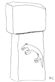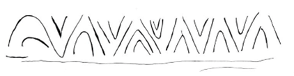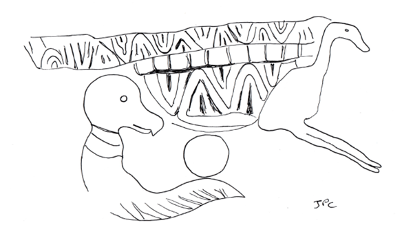 (Avec cette gravure, on ne peut pas ignorer la frise décorative en arrière-plan, qui rappelle étrangement un motif de la tranche d’une stèle de seuil de Gavrinis gravée en 4000 avant JC. Donc 5000 ans plus tard et 3600 km plus loin !).