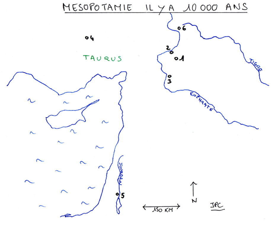 1 Göbekli Tepe, 2 Nevali Çori, 3 Dja’de, 4 Asikli, 5 Jericho, 6 Çayönü