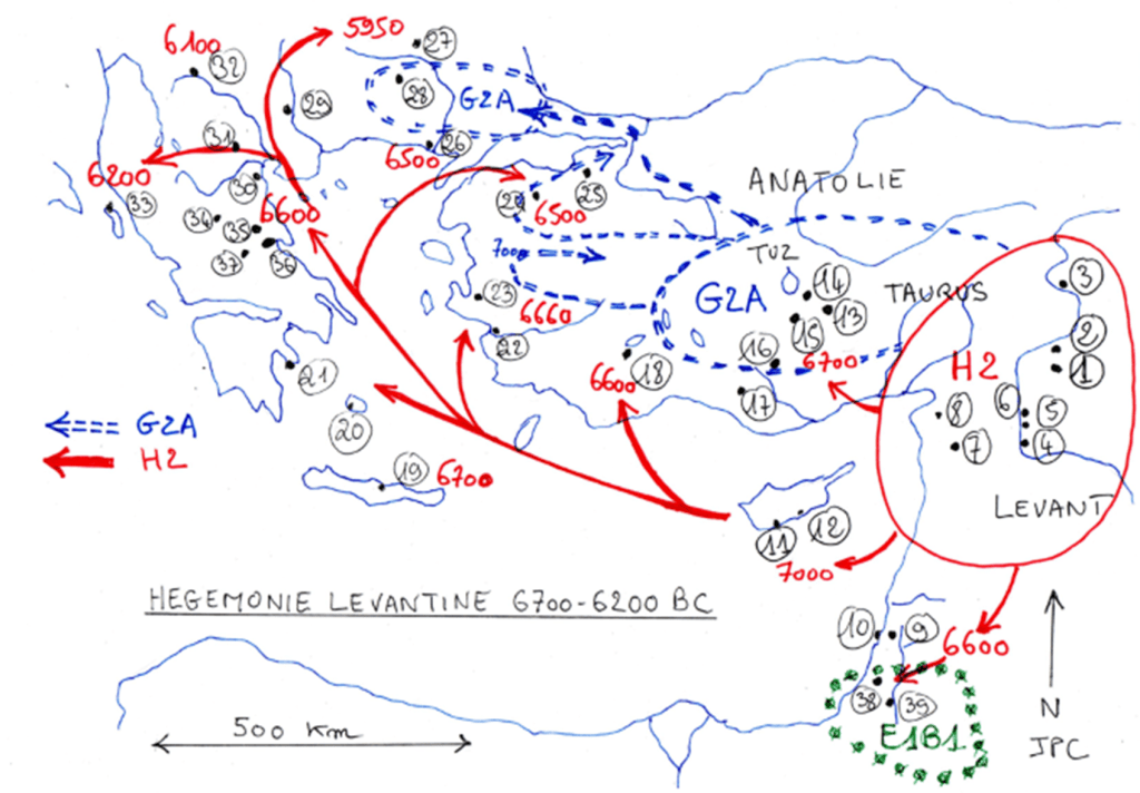 Milos (20) en mer Egée leur fournit l’obsidienne, et le sel récupéré un peu partout sur le rivage nourrit le bétail. Puis, la Thessalie (de 29 à 36) leur offre un espace vierge où ils vont pouvoir prospérer de 6700 à 6400 avant JC. Ils ne laissent toujours pas de sépultures dans le sol et ne se séparent pas des figurines aux yeux à grains de café. Le contact avec les G2a qui occupent alors la côte vers Smyrne et Marmara (24 à 28) semblait pacifique et fait d’échanges. Les sites peuplés de G2A de Curuciki (22) et Uluçak (23) sur la côte égéenne se fournissent en obsidienne à Mélos et sont initiés à la taille des silex par pression au levier dès 6700 avant JC, avant même ceux de Çatalöyük (16) en 6500 avant JC. Une étude plus poussée des évènements montre aux alentours de 6660 avant JC la présence simultanée de figurines féminines aux yeux en grain de café, de l’utilisation de la pression au levier pour tailler les silex avec un accroissement de la population. Ce sont les Levantins qui commencent à investir toute la mer Egée et chasser les G2A qui y avaient trouvé refuge. (voir annexe ci-dessous).