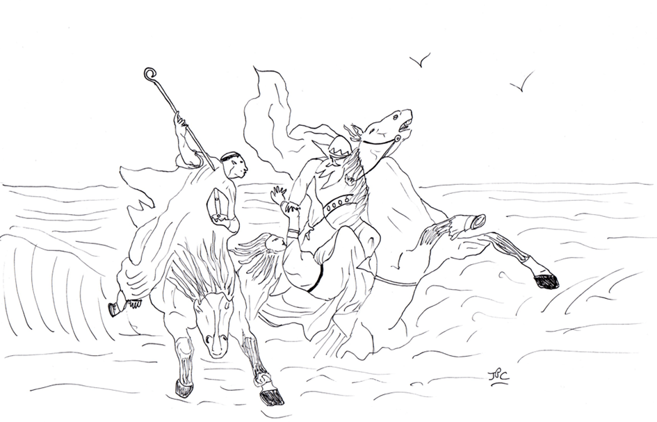 Les vagues gagnant du terrain viennent baigner les jarrets des chevaux. Le saint conseiller du roi agacé par le péril dit alors :