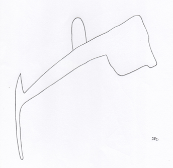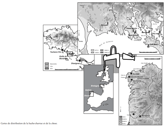 (*) Les gravures Carnacéennes sont les seules à représenter cette figure dans le monde néolithique. On a longtemps évoqué la représentation d’un objet mi-hache mi-charrue en rapport avec l’émergence de l’agriculture. Une autre gravure indéfinissable appelée « la chose » est retrouvée en Galice chez les fuyards carnacéens du Tsunami après 4300 avant JC : un peu différente, elle ressemble à un poisson mais semble éjecter de l’eau à partir de son crane comme le ferait un cétacé. S. Cassen, tout comme A. Whittle ont eu le mérite de donner un nom à ces gravures : « Cachalots ».
