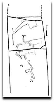Le Roux Charles Tanguy. A propos des fouilles de Gavrinis (Morbihan) : nouvelles données sur l’art mégalithique armoricain. In: Bulletin de la Société préhistorique française, tome 81, n°8, 1984. pp. 240-245; doi : https://doi.org/10.3406/bspf.1984.8777 https://www.persee.fr/doc/bspf_0249-7638_1984_num_81_8_8777. Détail : Gavrinis, face supérieure de la table de couverture de la chambre, relevé du décor piqueté et raccordement au « quadrupède » de la Table des Marchands