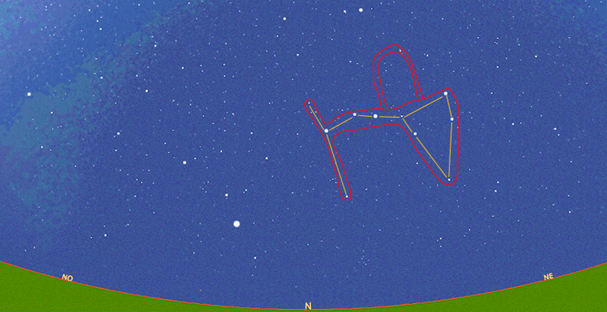 La direction évasée vers le Nord est plus intéressante, elle encadre le méridien sur 40 ° et englobe 2 constellations emblématiques :
