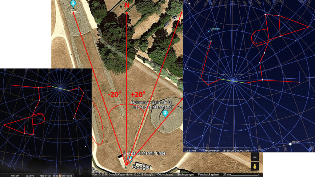 c) à gauche : autour de l’équinoxe de printemps 4600 av. J.C. dans la zone des angles identiques formés par les deux axes par rapport au méridien du site. (tiré de Google Maps et Stellarium 0.15.0, édité par Stefan Mäder 2022).