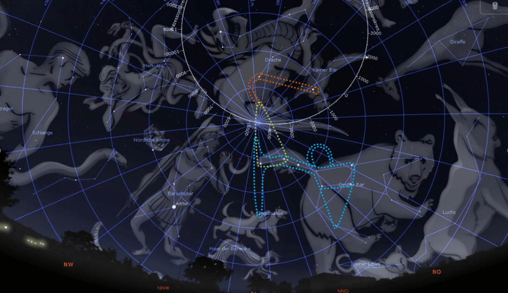 Pour se repérer avec le ciel d’aujourd’hui, notre étoile polaire se situe à notre époque au bout de la petite ourse (kleiner bär) sur le point 2000.