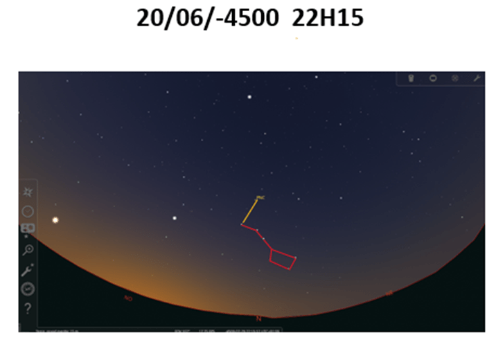 Position de la queue du cachalot par rapport au pôle nord céleste au coucher du solstice -4500 avant JC. (Stellarium/jpc)