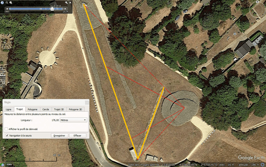3. Dolmen de Table des Marchands. Méridien du site à travers la fosse de fondation du GMB (Google maps est orienté vers le nord vrai, pas le nord magnétique).