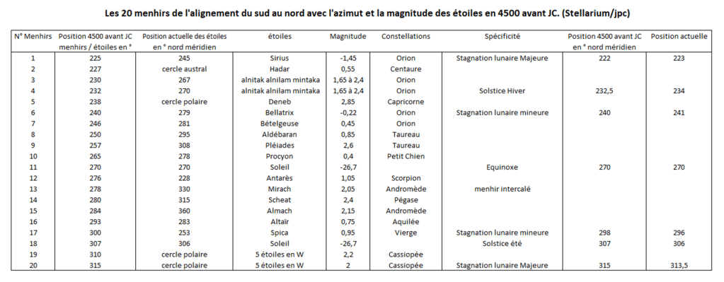 J’ai affecté l’étoile la plus brillante et la plus repérable pour chaque menhir de l’alignement, en pointant l’axe dalle de chevet/ menhir sur l’horizon. On peut ainsi désigner pour chaque nuit le menhir en lien avec la Lune.