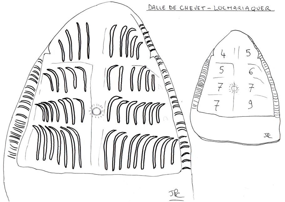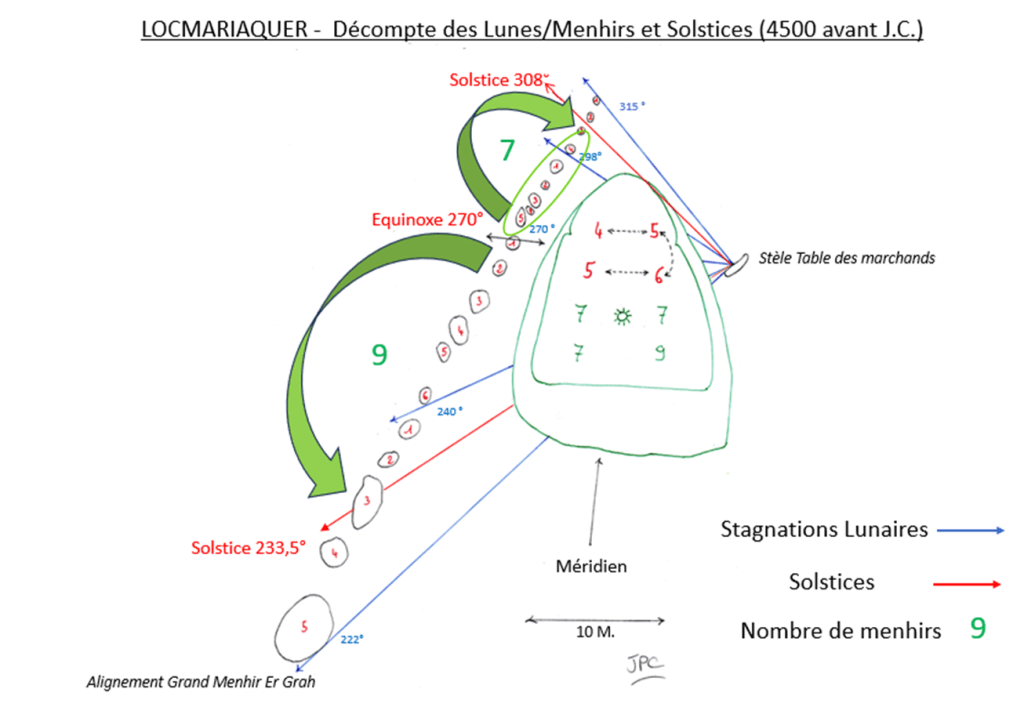 Avec l’association des astres, jours, crosses et menhirs, cette hypothèse de calendrier est séduisante et permet d’ouvrir des perspectives d’analyse pour de nombreux sites mégalithes. Je pense bien sûr aux henges Britanniques et aux rondels du Lengyel, mais plus proche de Locmariaquer, les carrés de Crucuno et Kerlescan restent à étudier sous ce paradigme. On pourra aussi poser le même regard sur les cercles de Göbekli Tepe, Atlit Yam ou Nabta Playa. La pyramide de Kheops possède ses 4 arêtes en direction de 4 points cardinaux. Mais il faut s’en tenir aux preuves archéologiques et d’autres raisons ont probablement présidées à ces orientations. Pour Locmariaquer nous avons la chance de disposer d’un site quasi intact avec des fosses à menhirs bien répertoriées, et surtout grâce à cette pierre, témoin inespéré pour une lecture pertinente de l’époque.