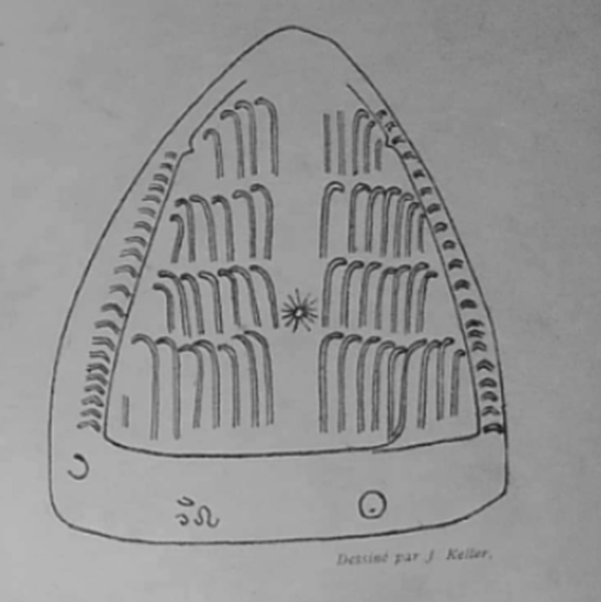 Comme tout objet altéré par le temps, on peut contester l’aspect réel de cette gravure, et les croquis relevés par les archéologues divergent :
