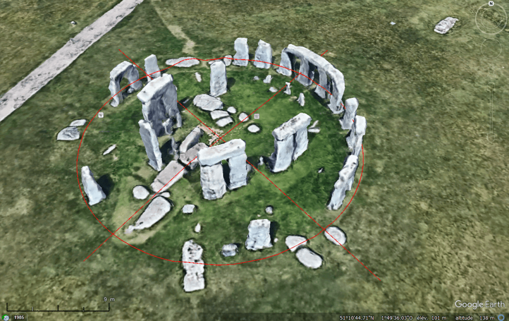 Position des stagnations lunaires sur Stonehenge avec Google-Earth (jpc)