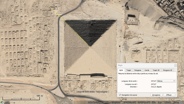 Image Google Earth de Khéops avec calcul de l’axe des arêtes (jpc).