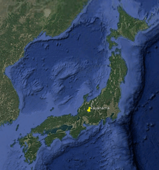 (Image Google Earth du Japon avec repère du site Hida Kanayama (entre Takayama et Gujo).