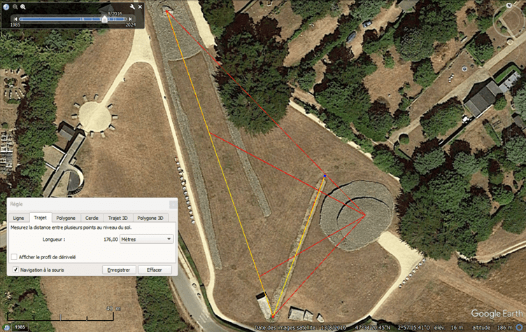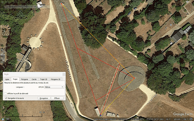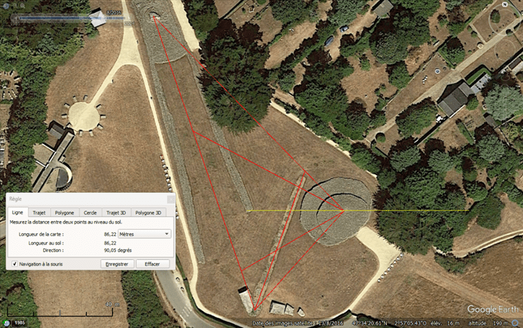 Si cette géométrie parfaite semble anachronique pour la préhistoire il y a près de 7 000 ans, il faut rappeler que les architectes se sont bornés à viser les astres dans le ciel et sur l’horizon pour placer leurs mégalithes. Nous avons la chance de pouvoir disposer ici d’un système de repérage complet et intact et les fosses des menhirs disparus suffisent à notre analyse.