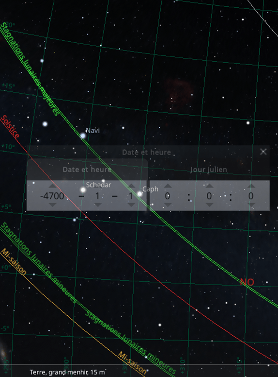 Stellarium version 24.4 Archéo astronomie. Copyright (C) 2000-2024 Stellarium Developers .Stagnation lunaire majeure Nord-Ouest à 315 °en 4700 avant JC selon Stellarium (jpc) Les 5 étoiles en W de Cassiopée.