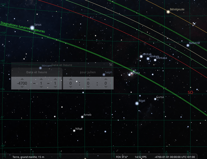 Stellarium version 24.4 Archéo astronomie. Copyright (C) 2000-2024 Stellarium Developers . Stagnation lunaire mineure sud-ouest à 222° en -4700 avant JC selon Stellarium (jpc) Les 3 étoiles alignées appartiennent à la constellation d’Orion.