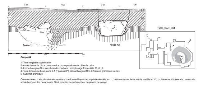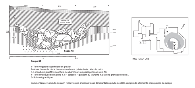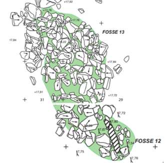 c) Il y a bien 19 fosses qui ont été soigneusement analysées par les chercheurs, un 20ème menhir aurait été glissé dans la fosse 13 en partant du sud et en contact avec la fosse 12. (Cassen et al.,2009). On verra ci-après son importance et comment on peut le justifier.