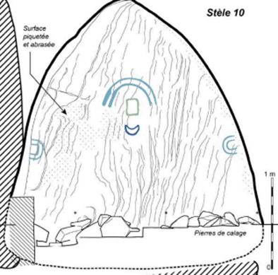 La pierre est lourde et exogène, mais ce qui est notable c’est qu’elle est gravée en champlevé. Cela signifie que l’on a pris le temps de frotter le grès très dur autour des motifs pour faire ressortir des signes réguliers. Cette technique très différente de la partie opposée est typique de la culture Castellic. Je suggère que cette œuvre a été réalisée en deux temps : au début, la dalle est un capteur ordinaire pour les ombres lunaires de l’alignement initial. Elle sert de repère Astronomique pour les premiers occupants du site vers 4700 avant JC ; puis les Carnacéens de culture Cerny arrivent sur le site et s’imposent vers 4500 avant JC.