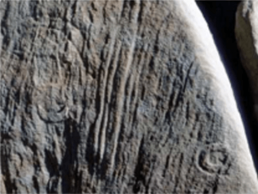 De ce côté, le grès est strié et semble abimé. Les gravures ont été creusées dans la pierre.