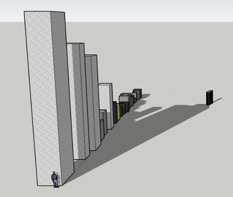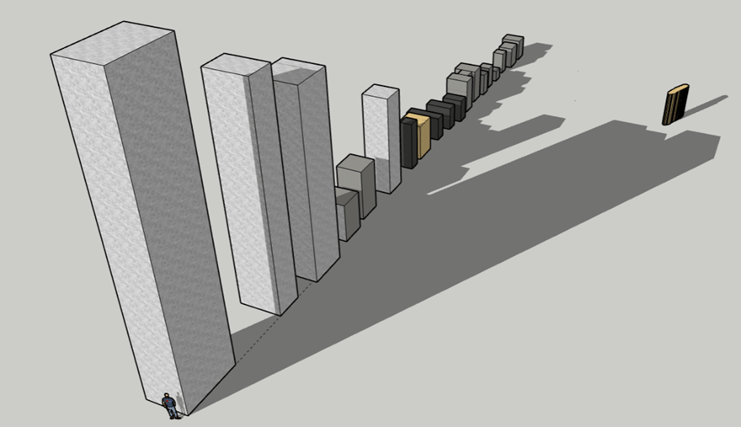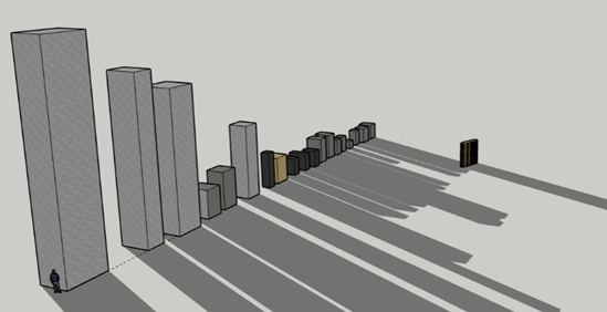 Compte tenu de ce qui a été dit sur l’orientation des stagnations lunaires majeures nord et sud qui convergent vers cette dalle j’ai réalisé cette représentation 3D avec le logiciel SketchUp (Les grands menhirs en orthogneiss au sud, les menhirs en granite local au nord, et ceux en sillimanite plus sombre au centre) :