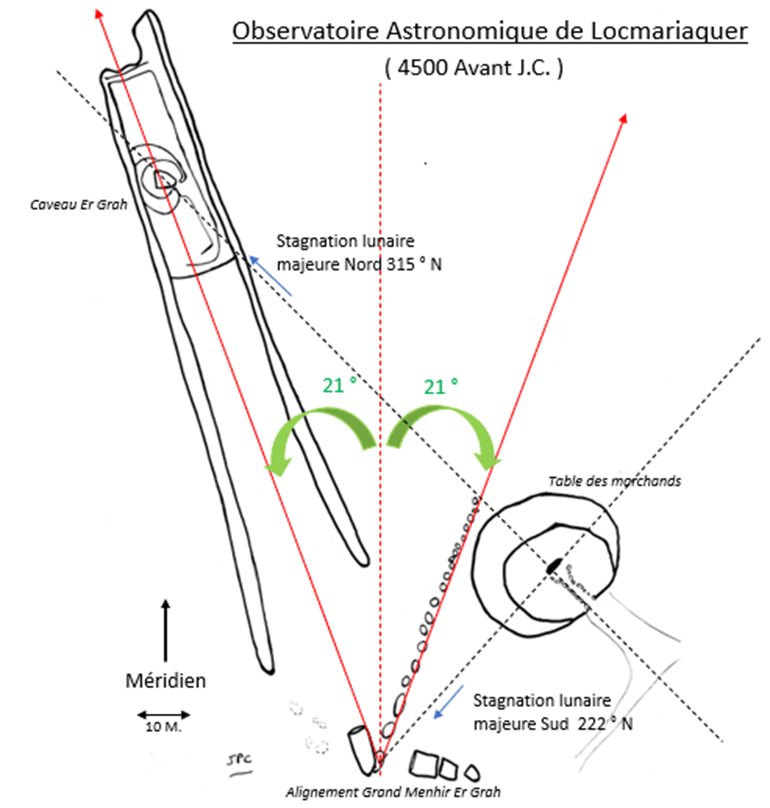 En partant du cœur de la dalle de chevet de la Table des Marchands, Le premier axe de 106 mètres rejoint le cœur du tumulus Er Grah avec un angle de 315 ° Nord. Le deuxième axe de 51 m rejoint la fosse du Grand Menhir brisé avec un angle de 222° Nord. Ces 2 mesures d’angle correspondent parfaitement aux 2 maximums des stagnations lunaires majeures. Il y a 6700 ans, la lune ne dépassait jamais ces bornes sur l’horizon, et les hommes de la préhistoire avaient remarqué cette particularité. Le fabuleux logiciel STELLARIUM me donne ces limites pour cette période : 315° et 222 ° Nord. (La déclinaison lunaire joue peu, et on obtient aujourd’hui en 2025 :315° et 224° Nord).