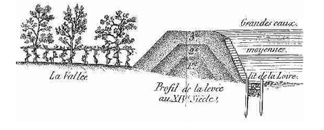 » Dans certaines parties, la Loire est alors bordée de loin en loin par des emplacements naturellement ou artificiellement surélevés. Ces aménagements primitifs échappent souvent à toute entreprise de datation. Des grandes digues médiévales se superposeront donc à ces turcies moins élevées et beaucoup plus anciennes.