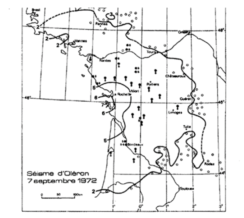 Le 07/09/1972 à 22h30, une violente secousse frappe la côte ouest de l’île d’Oléron et est ressentie dans une grande partie de la France. Quelques arrondissements parisiens à 420 KM sont atteints (les bassins sédimentaires facilitent la transmission des ondes sismiques). Des immeubles de Bordeaux voient les habitants apeurés descendre dans les parkings (les bâtiments en étages élevés et sous-sol profond sont plus sensibles aux vibrations souterraines). Les sismographes du monde entier enregistrent la secousse dont celui de Brisbane à 16 925 Km. L’intensité évaluée est de 5.7° sur l’échelle de Richter. Dans un large arc de la façade Atlantique Française il y a de nombreux dégâts sur les habitations, pour Saint-Pierre d’Oléron 15 maisons lézardées, 400 cheminées tombées et électricité coupée, mais un seul décès est à déplorer, lié au stress. Des répliques auront lieu dès le lendemain à 2 h, 3 h. et vers 7 h du matin, puis pendant 4 jours, mais de moindre intensité.