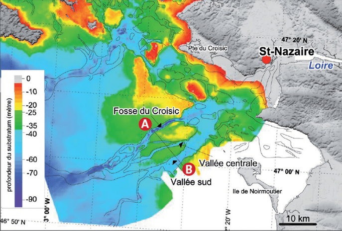 La coupe AB réalisée en 2010 montre que l’estuaire de la Loire s’écoulait vers la mer avec plusieurs bras lors de la période glaciaire. Le cours principal semble être celui de la fosse du Croisic détaillé ci-dessous :