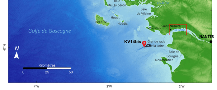 Le 16/07/2015, Le Pourquoi pas ? réalise pour le compte du SHOM lors de la campagne DYNSEDIM 2015 une carotte KV14Bis de 5.4 mètres de long à 58 mètres de profondeur et située à la latitude Nord 47°17’10’’ et longitude Est 2°33’32’’.