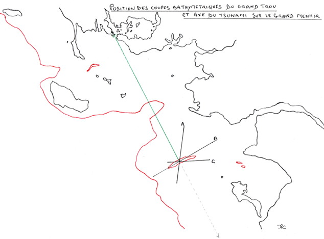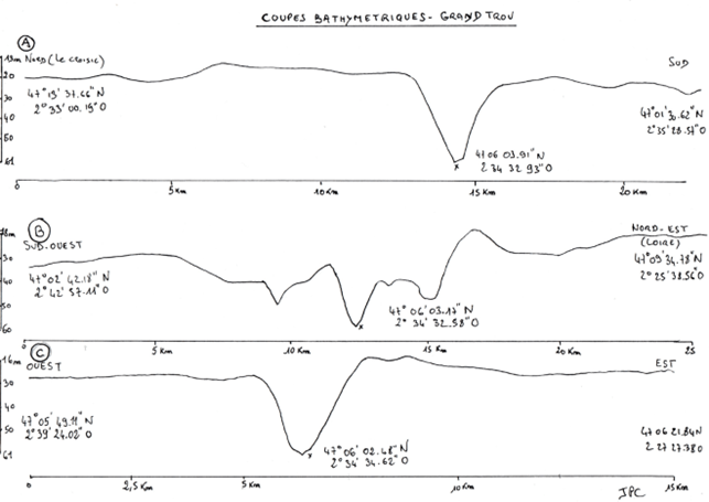 Nous regrettons donc que la carotte effectuée n’ait pu descendre plus en profondeur et confirmer ou infirmer notre thèse d’une sortie de méthane au niveau de cette fosse aux alentours de 6300 avant aujourd’hui. Compte tenu de la sédimentation régulière de 5.4 m pour 2500 ans, il faudrait théoriquement creuser 14 mètres sous le niveau du plancher océanique soit 75 mètres sous le niveau marin actuel pour se faire une idée. Sachant que le plancher océanique entourant cette fosse se situe à 30 mètres de profondeur, il y a 12 000 ans l’endroit était émergé et la fosse était un lac profond retenant les eaux de la Loire. Dans notre livre, nous tentons de dessiner le relief à partir de la bathymétrie et réalisons 3 coupes.